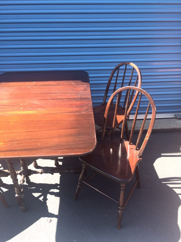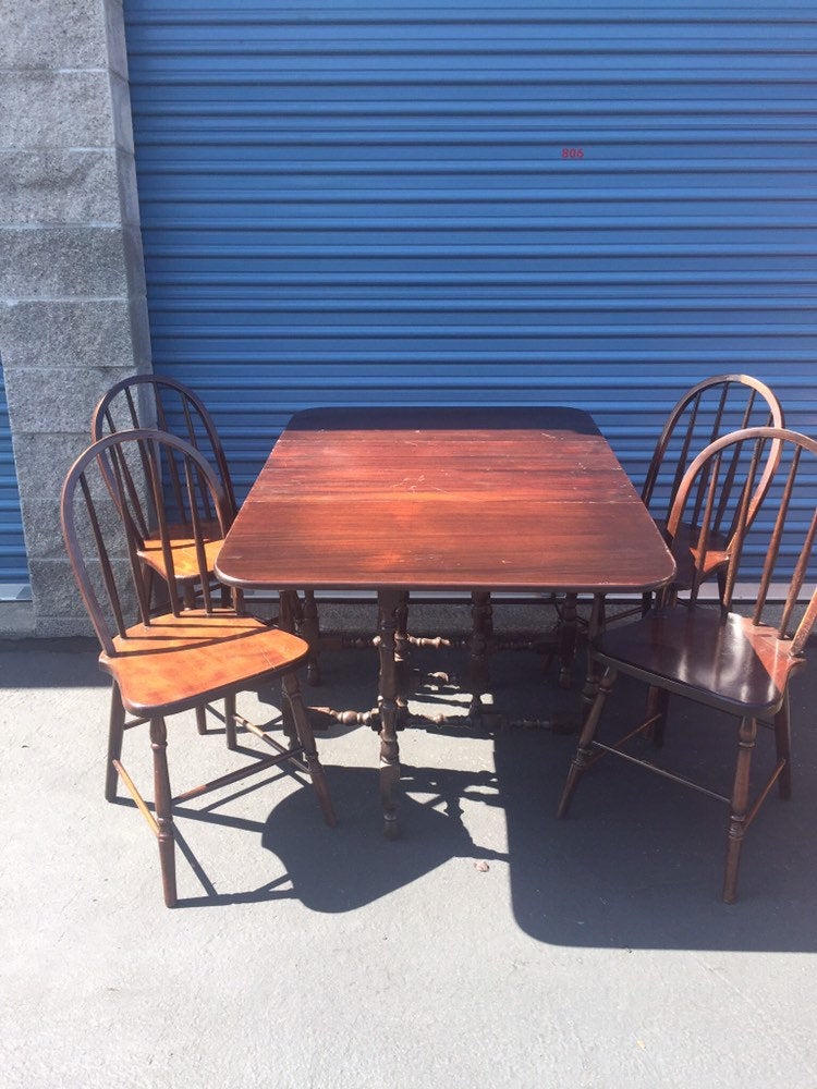Drop leaf table with 1 leaf that is stored inside the table, 4 chairs and table pads. Good shape.