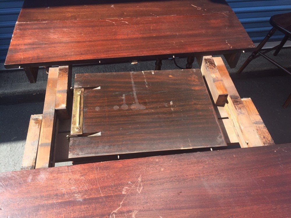Drop Leaf dining table can be used in a variety of size and shapes. Can be as small as 2x3 feet and expand all the way to around 6x3 ft. Includes custom table pads.