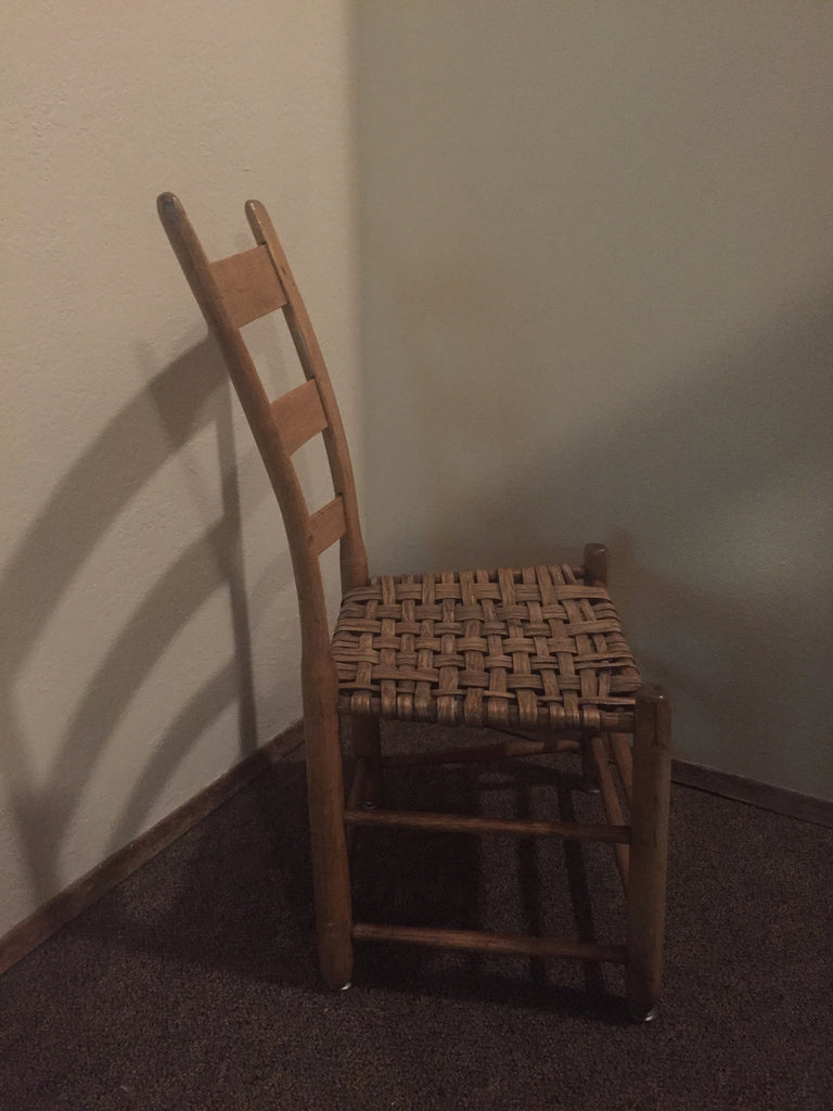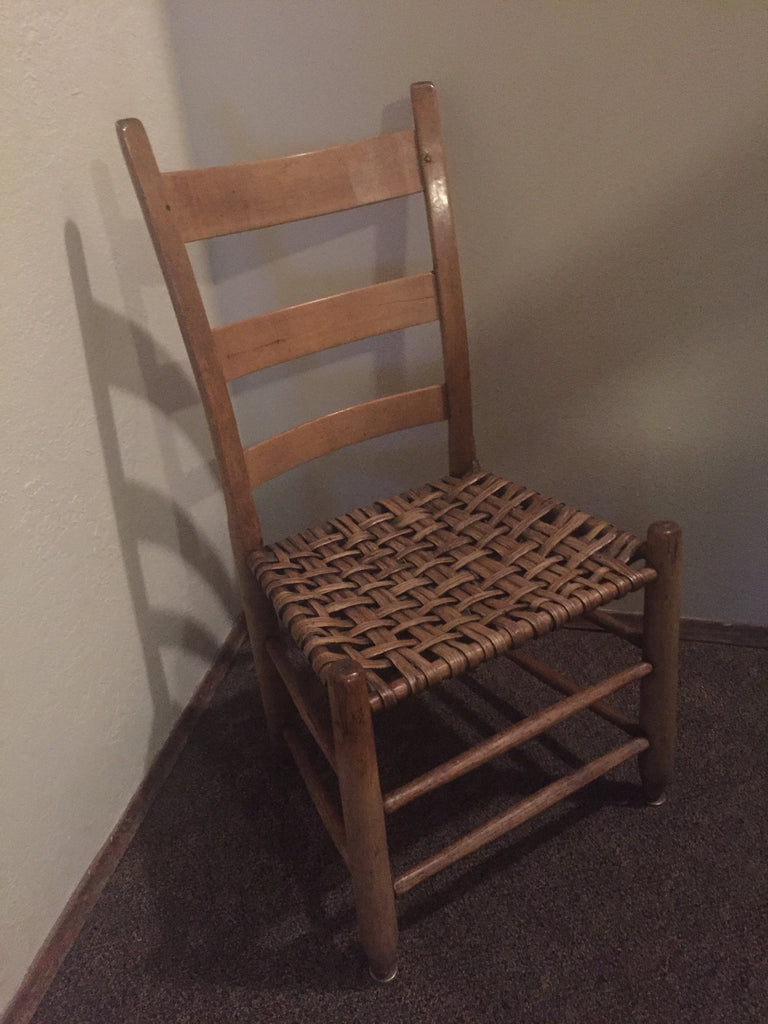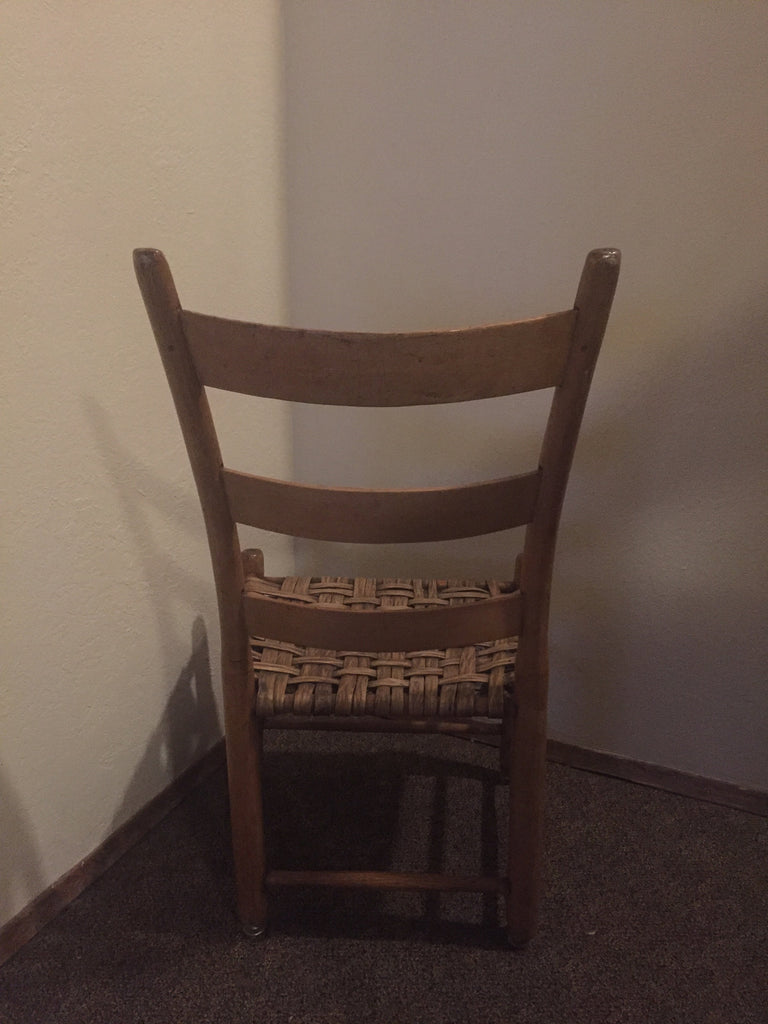 Vintage maple primative childs chair with woven reed seat in excellent antique condition. Woven flat reed seat. It is sturdy and tight. Age appropriate wear. There are 2 available, sold separately.