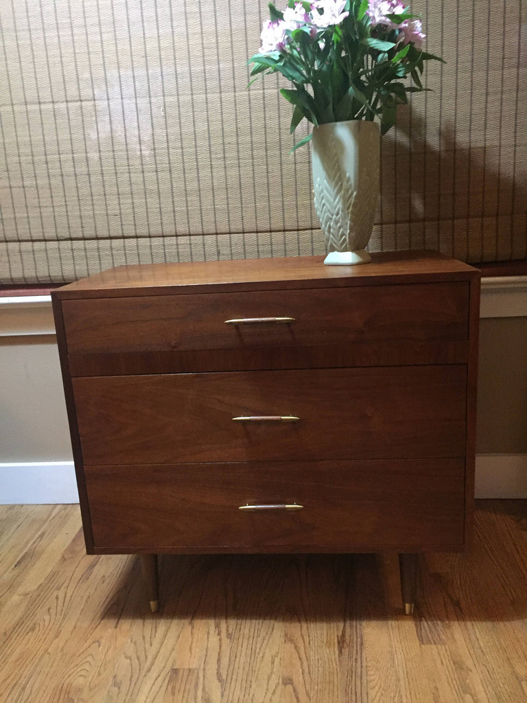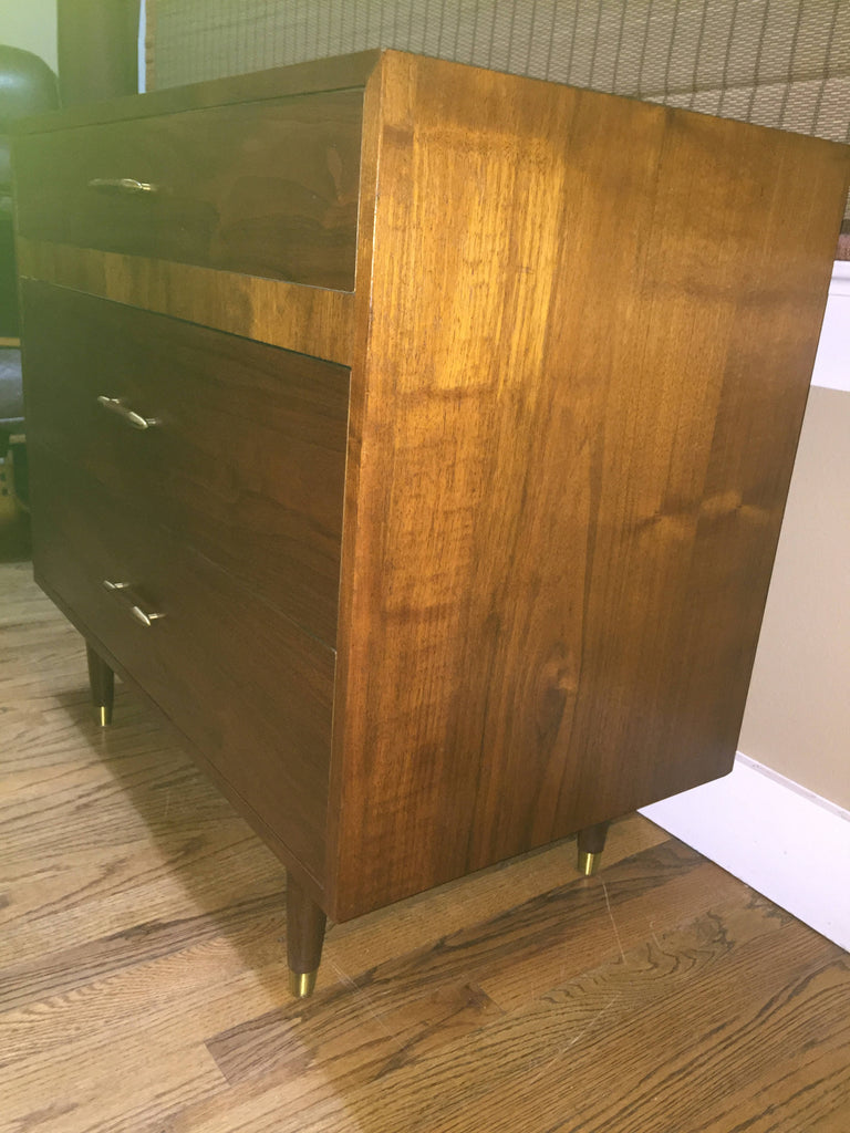 Vintage Danish Modern Three Drawer Low Chest or Dresser. Unknown maker. Appears to be custom made, with dovetail joints, veneer drawer fronts and solid walnut wood cabinet construction. Beautiful and stylish twin bullet point walnut and brass drawer handles. Brass capped spindle legs. Pretty warm golden patina.