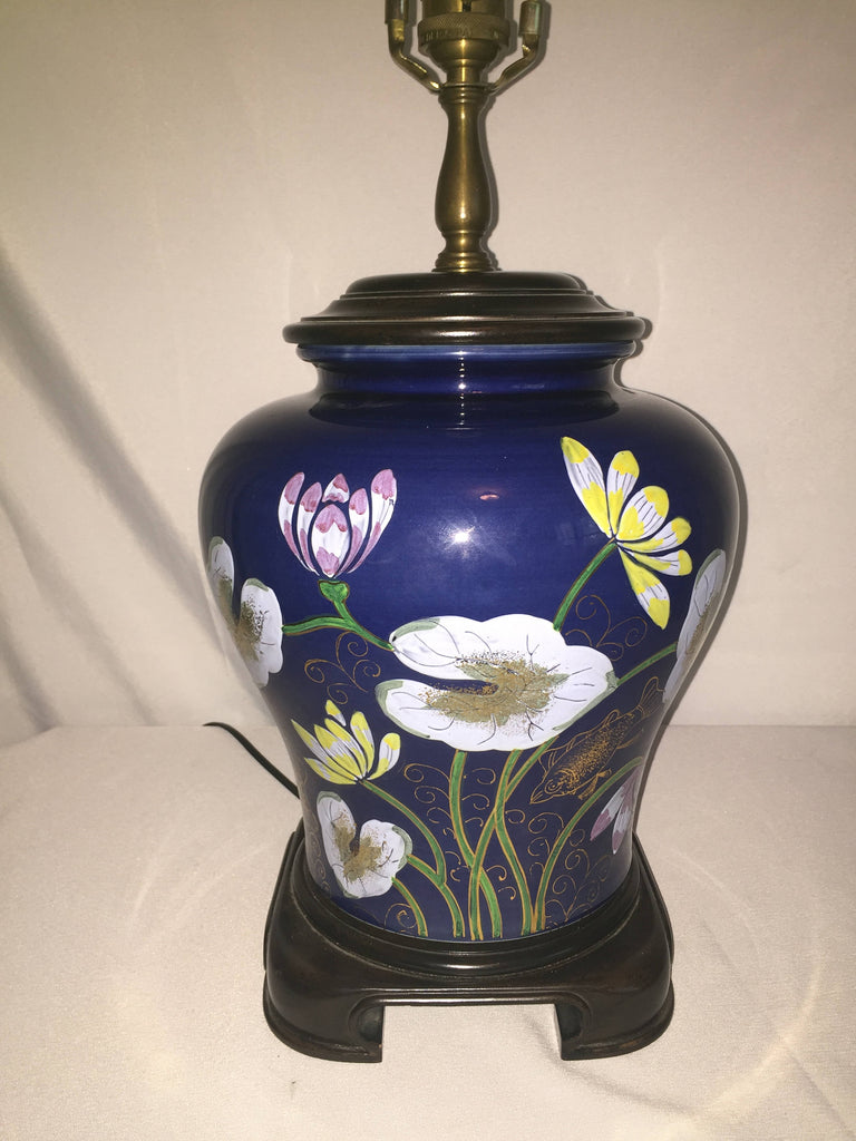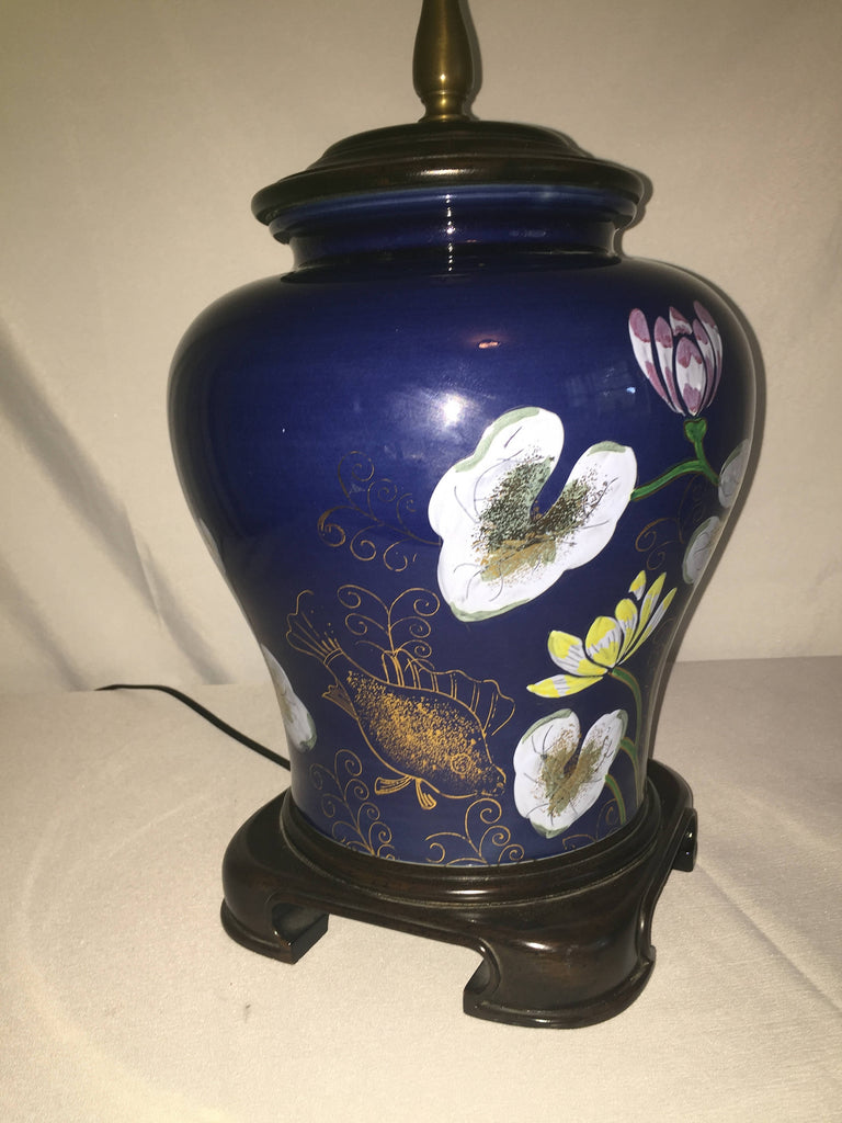 Beautiful vintage WILDWOOD Ginger Jar Lamp with water lilies and a Gold goldfish painted on a navy blue jar, beautiful wood footed base and wood "lid" on jar. The original shade comes with the lamp.