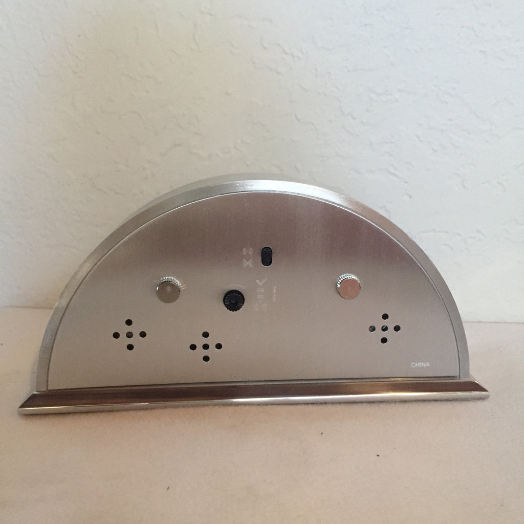 Finished in brushed and polished silver-tone, this semi-circular metal clock combines contemporary flair with the additional function of a hygrometer and thermometer. The dials feature circular, diamond-cut numeral rings, black Roman numerals, black hour and minute hands, and silver second and alarm hands. A full felt bottom protects your tabletop. Quartz, alarm movement includes 1 "AA" battery. Silver-tone finish.