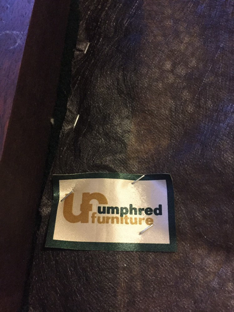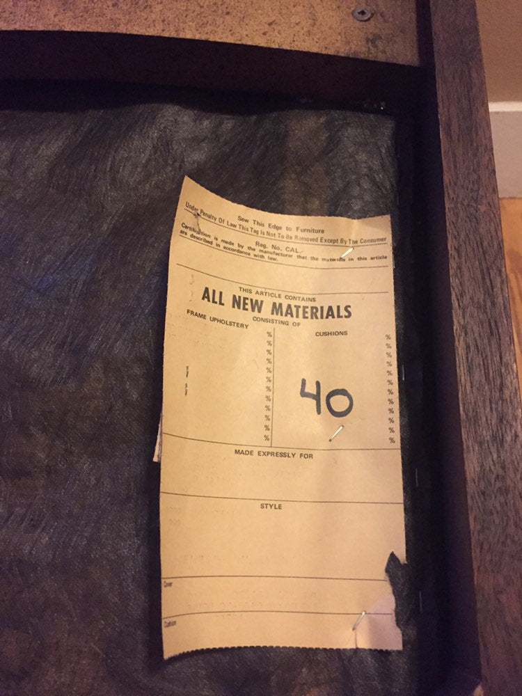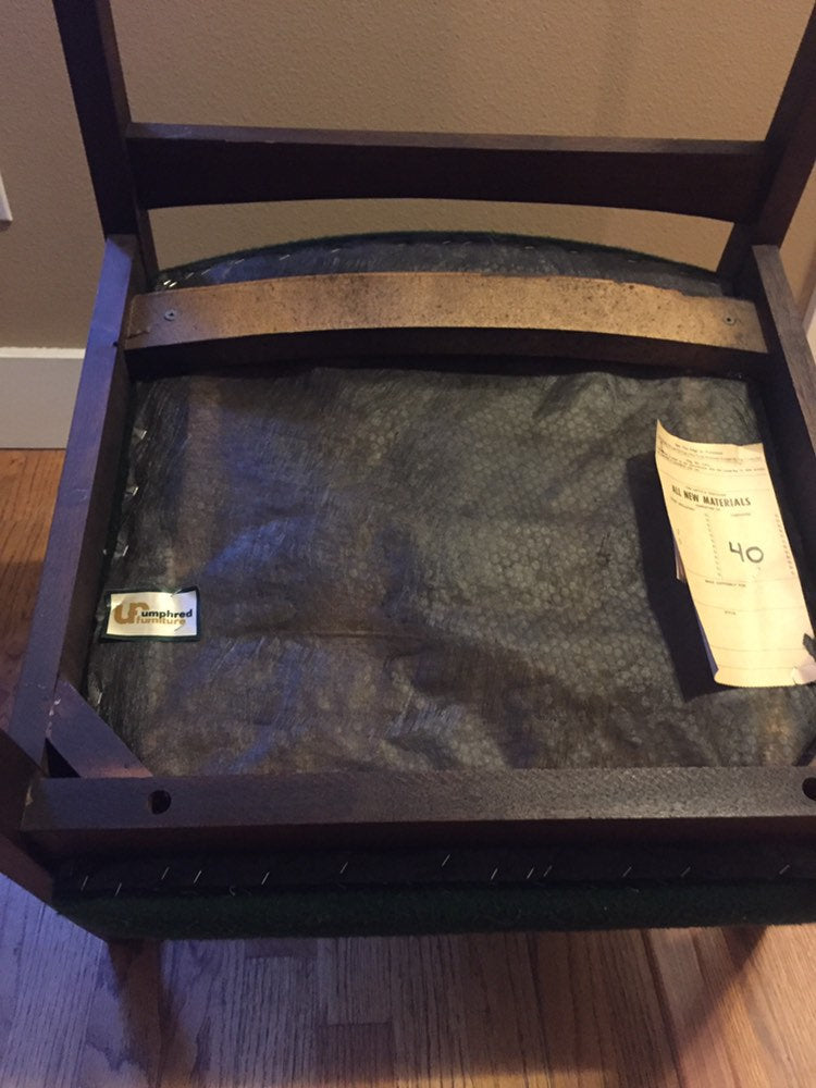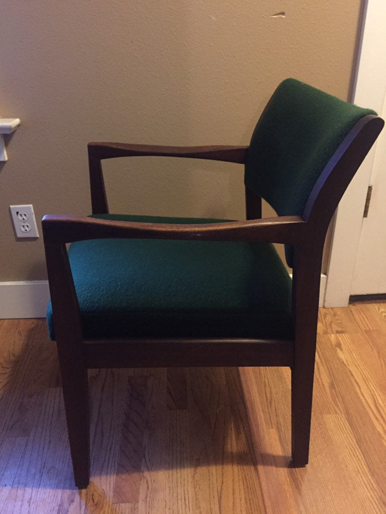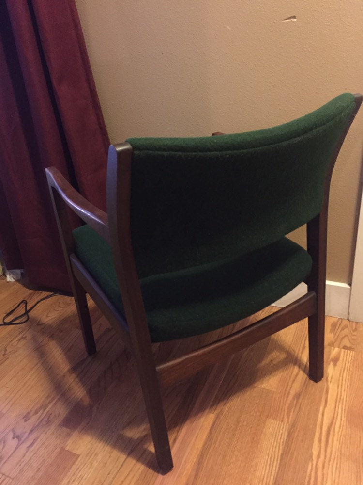 Solid walnut frame, The solid wood frame is solid and sturdy with only very minimal wear from age.The hunter green wool upholstery is in very good condition also. The Chair was reupholstered at some point in it's life by the prestigous upholstery company, Umphred Furniture in Berkley, CA. for which it now bears it's maker's mark tags on the underside of the chair.