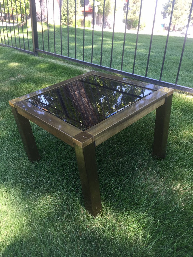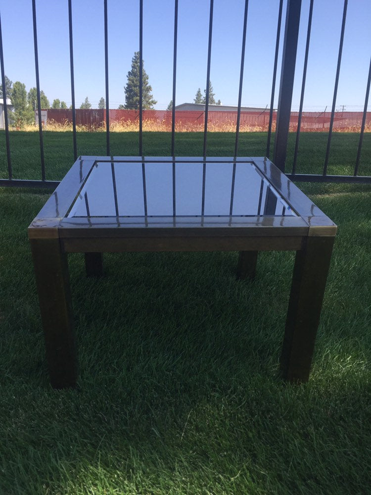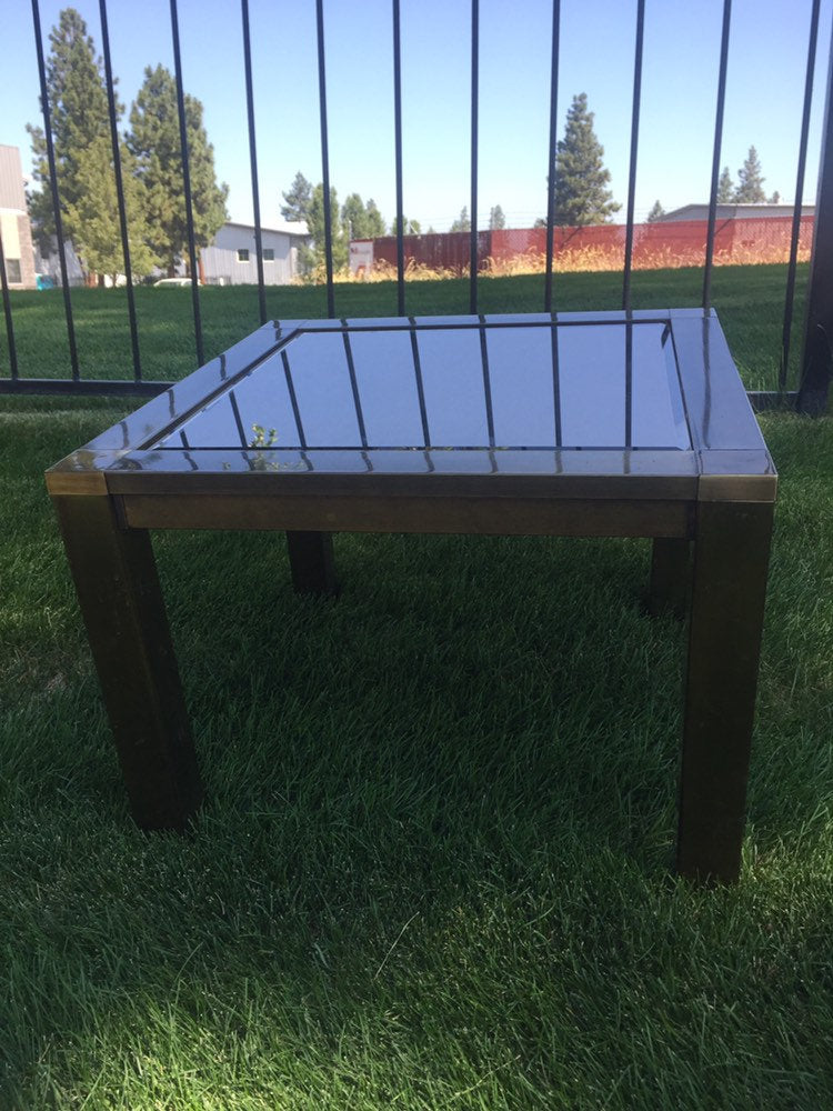 This is an amazing Milo Baughman hollywood regency side table. This heavy side table has an antique brushed brass finish with a bronzed mirrored glass top. Excellent vintage condition, very small chips to corners of glass table top.