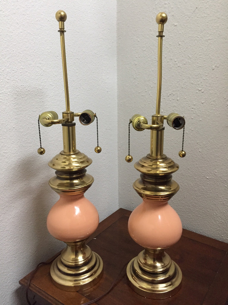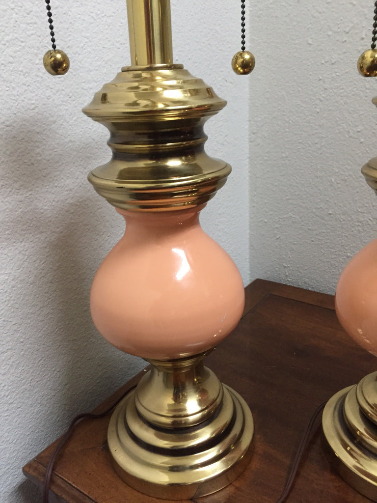 Pair of Vintage Stiffel Peach Ceramic and Brass Table Lamps with earring pull switch