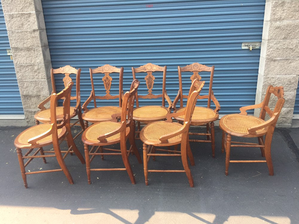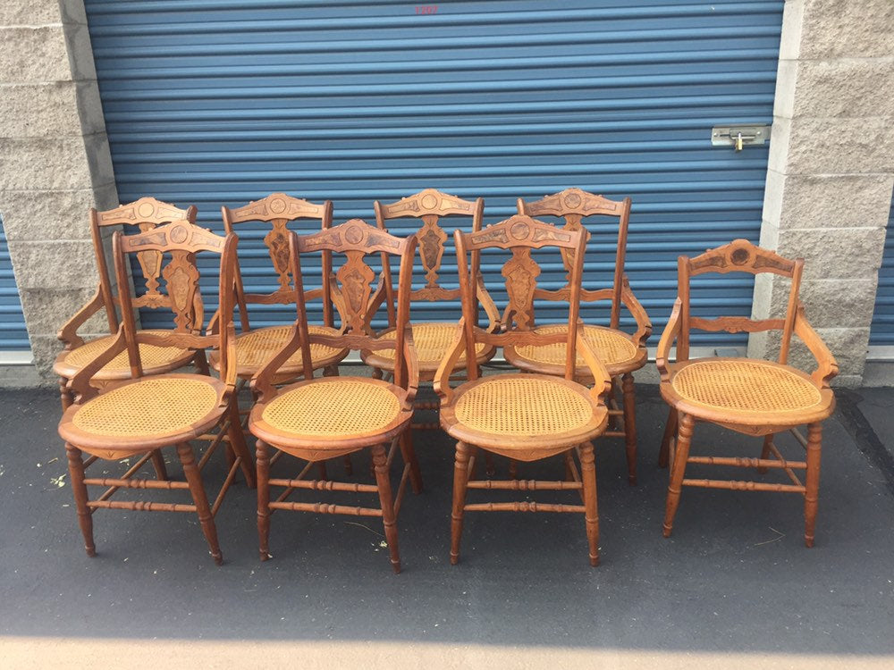These chairs show signs of wear as to be expected with slight scratches. There are several old and professional repairs to the seat backs. These repairs are probably 100 yrs old themselves.