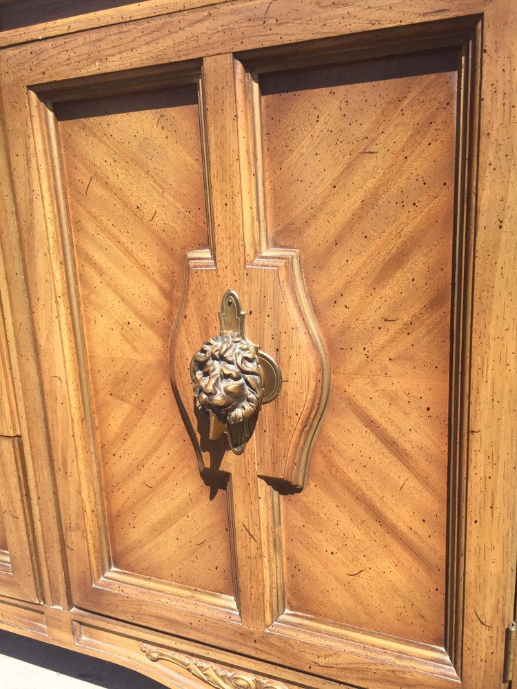 This chest includes nine drawers with dovetail joinery, six with fixed pulls in a brass tone, 3 behind center door with Lions Head hardware. Wonderful classic styling, very heavy and well made. Excellent vintage condition.