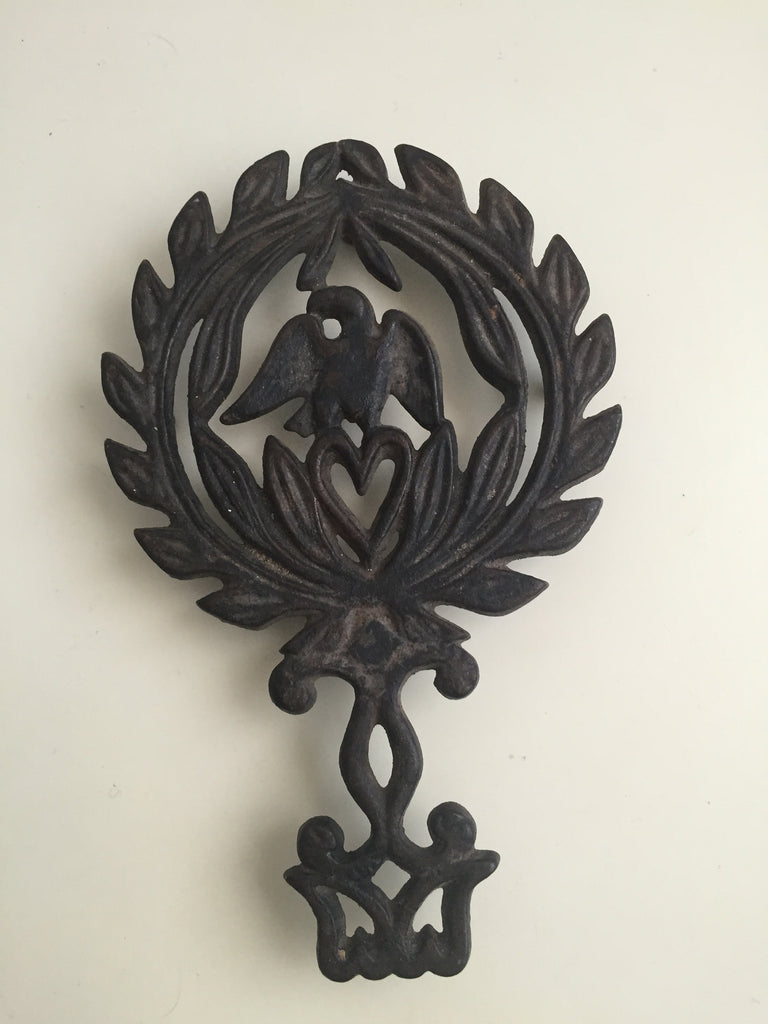 This is a nice Vintage Ornate Black Cast Iron Americana trivet, pot holder. This sturdy trivet has an eagle and heart design with olive branches on the side.