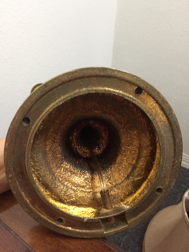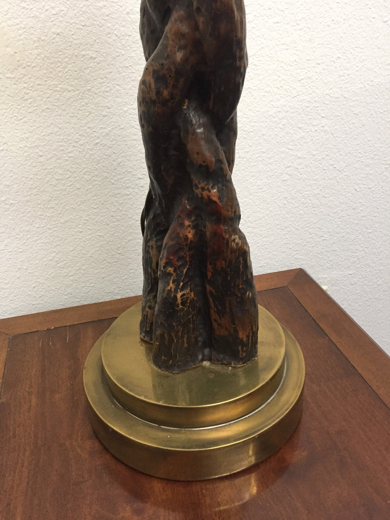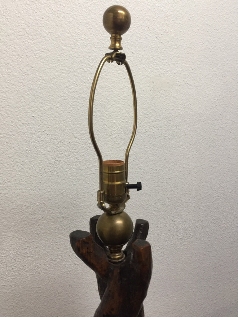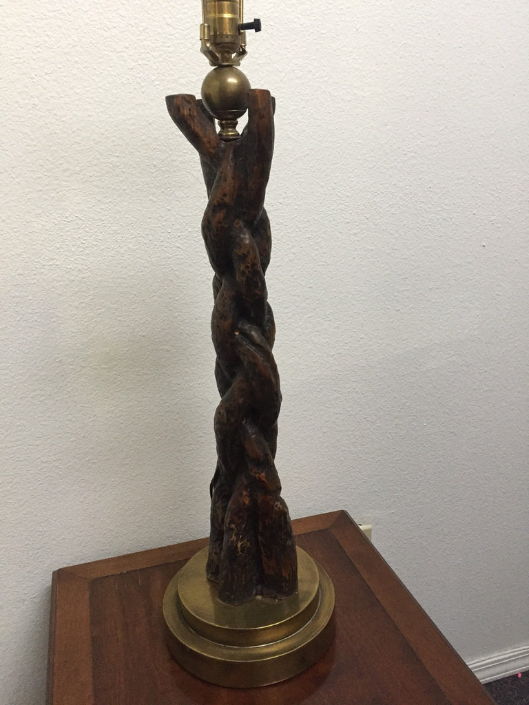 In great working condition. The brass base has patina from the age. The lamp is photographed with a Pine wood and linen shade that can be purchased separately for $30.00. The shade measures 16" diameter x 9" high.