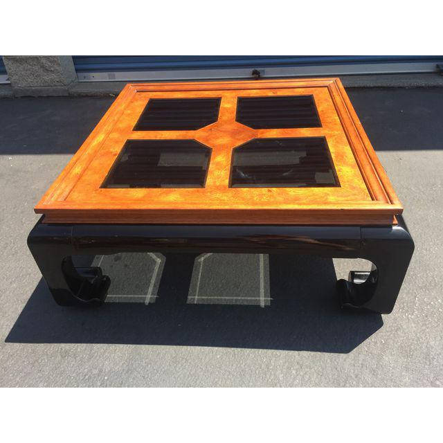 Vintage Century Furniture Chin Hua Ming Style coffee table/cocktail table. Black and burled wood with glass inserts. In good vintage condition with some cosmetic blemishes. Repaired leg, some small surface scratches to the finish of the top smoked glass, as well as some small scuffs to the black finish on the legs.