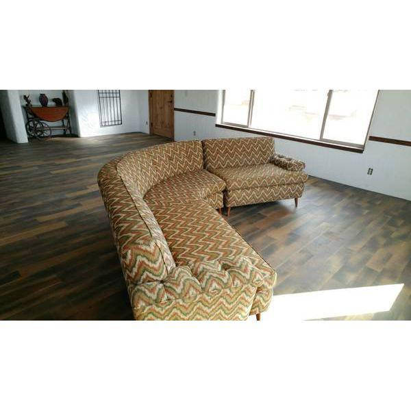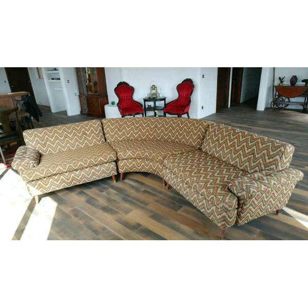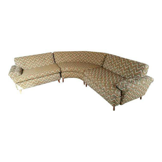 A mid century modern three piece sectional sofa with sleek sculptural design made by Kroehler. One curved center section measuring 66" wide, 37" deep, and 29" high. Two end sections each measuring 48" wide and 37" deep. The seat heights are 16.5".