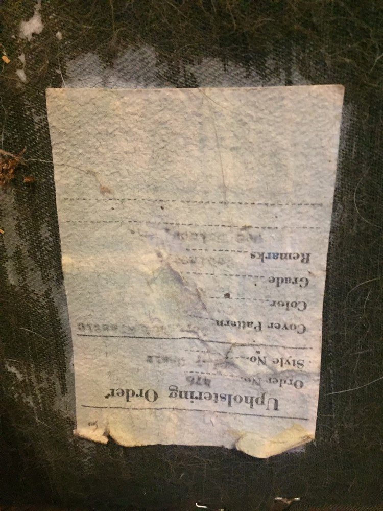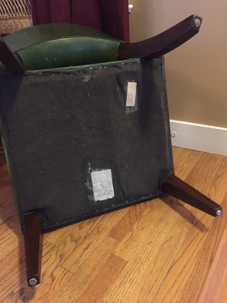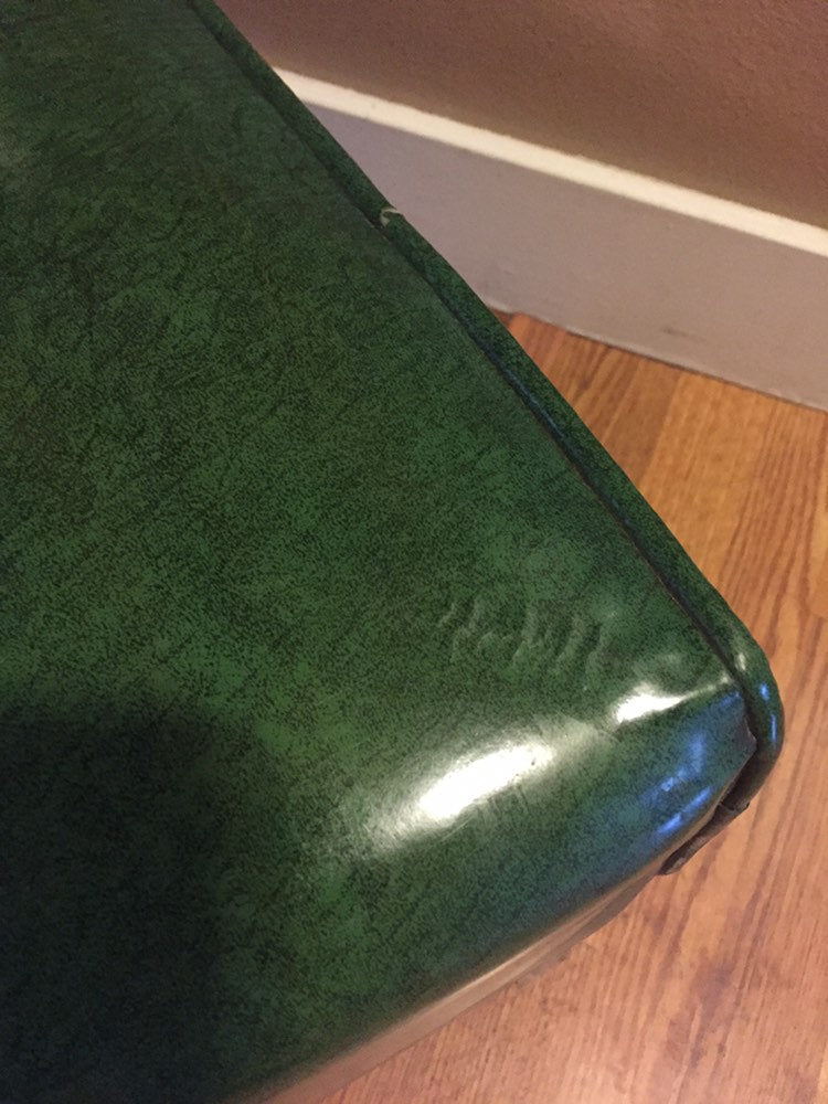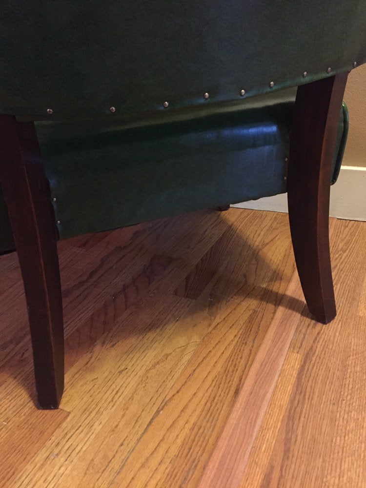 Brown wood finish with a Green Vinyl fabric and Button Back. The design and style are timeless and classic on this Early Mid-century beauty!