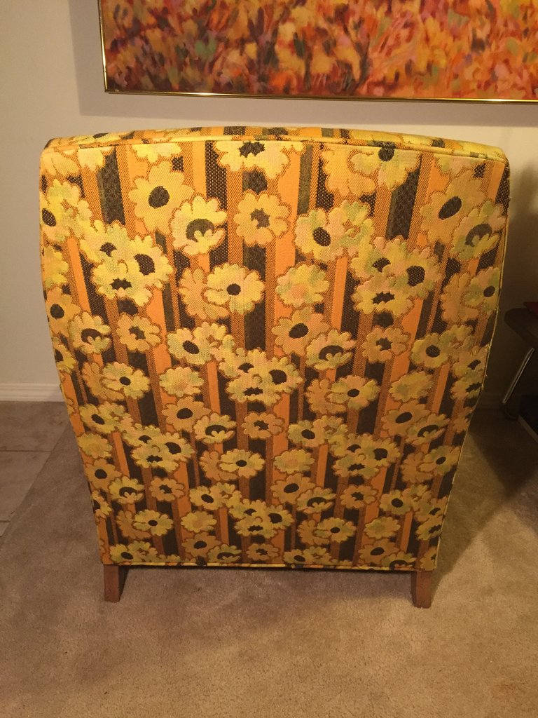 Chair is in excellent condition but should be cleaned to brighten the fabric. No holes or tears. Comes with arm rest covers and 1/2 yd of extra fabric to make pillows to match